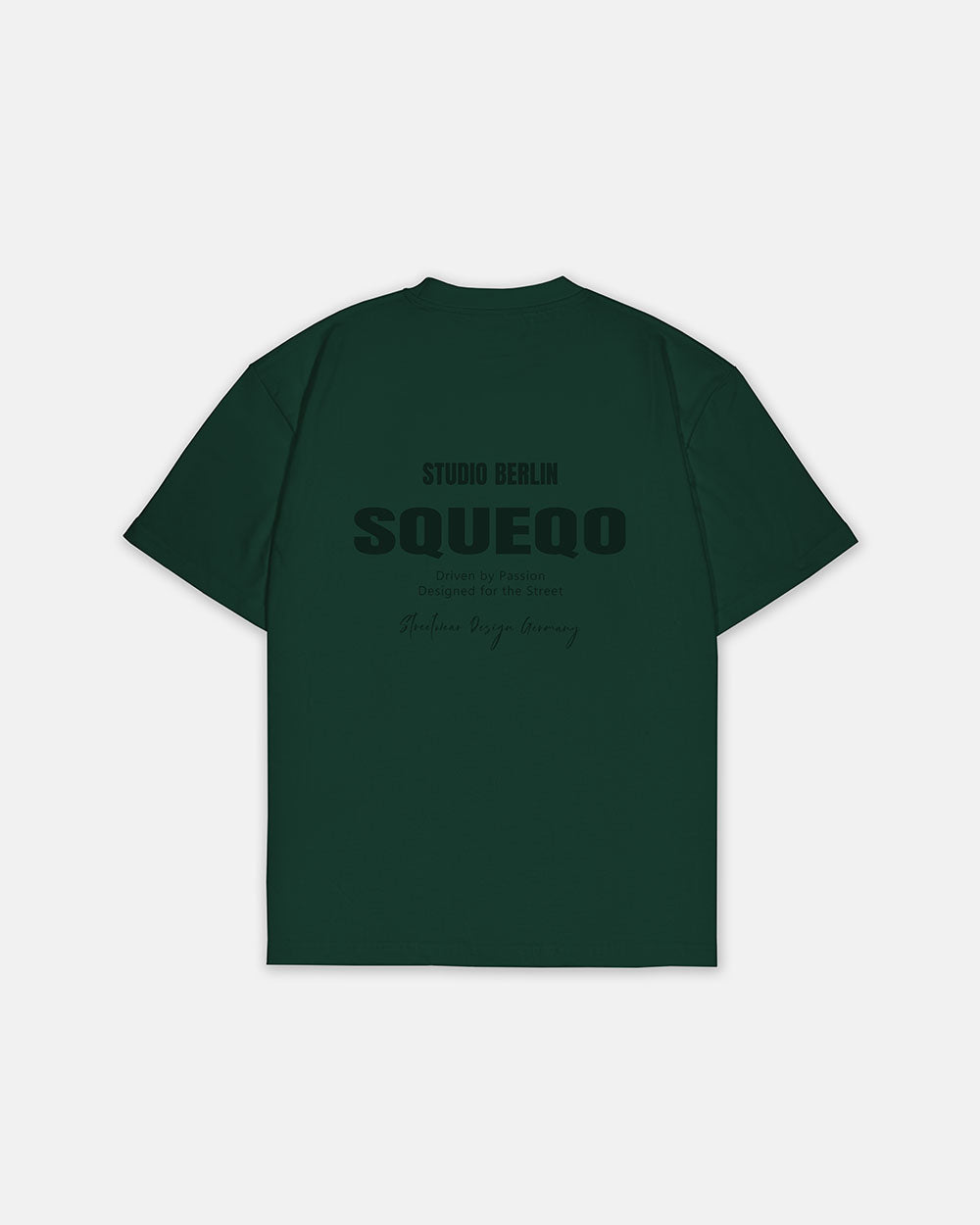Dunkelgrünes T-Shirt mit monochromem Studio Berlin SQUEQO Print auf der Rückseite