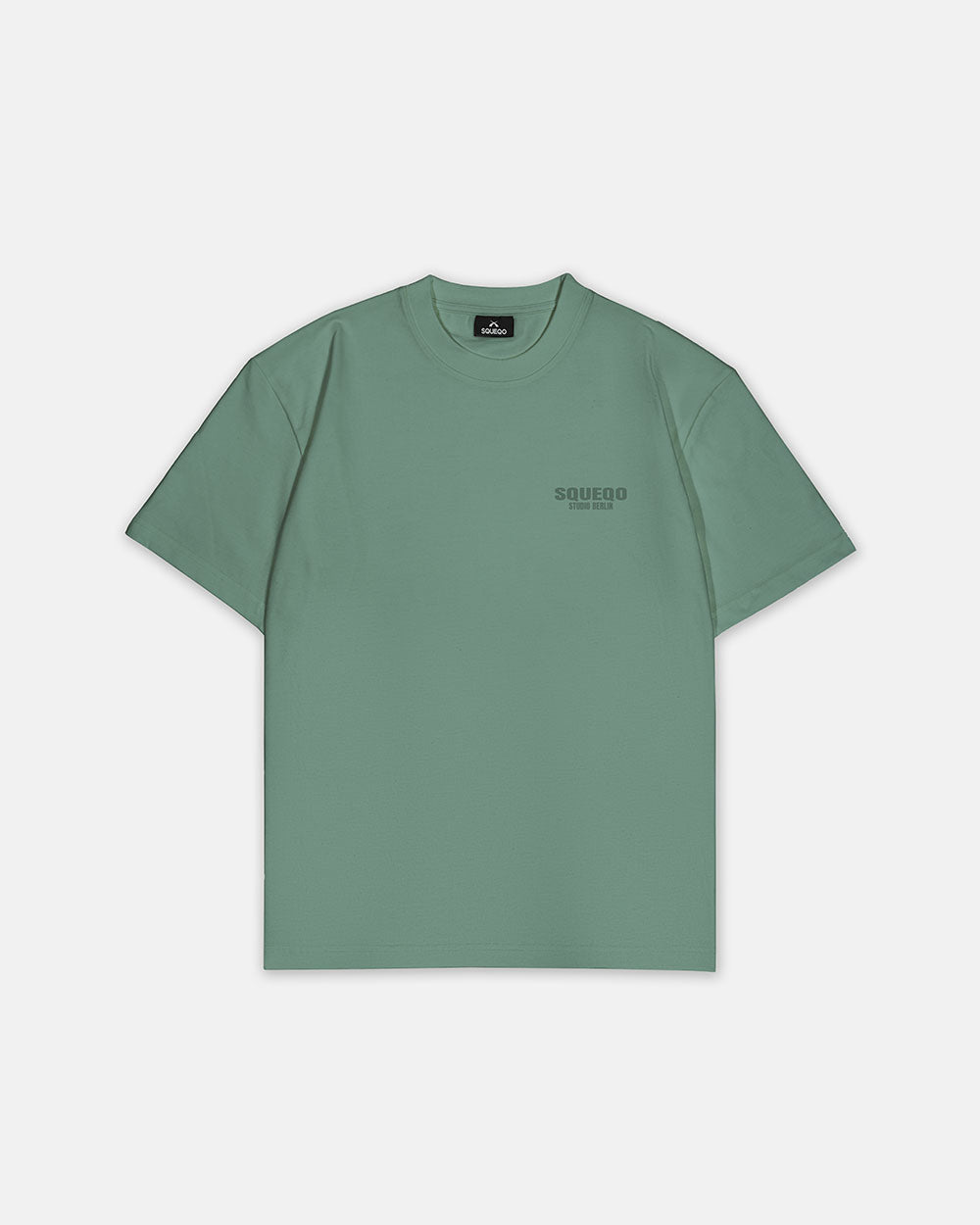 Eukalyptus-Grünes T-Shirt mit monochromem Studio Berlin SQUEQO Print, Vorderansicht.