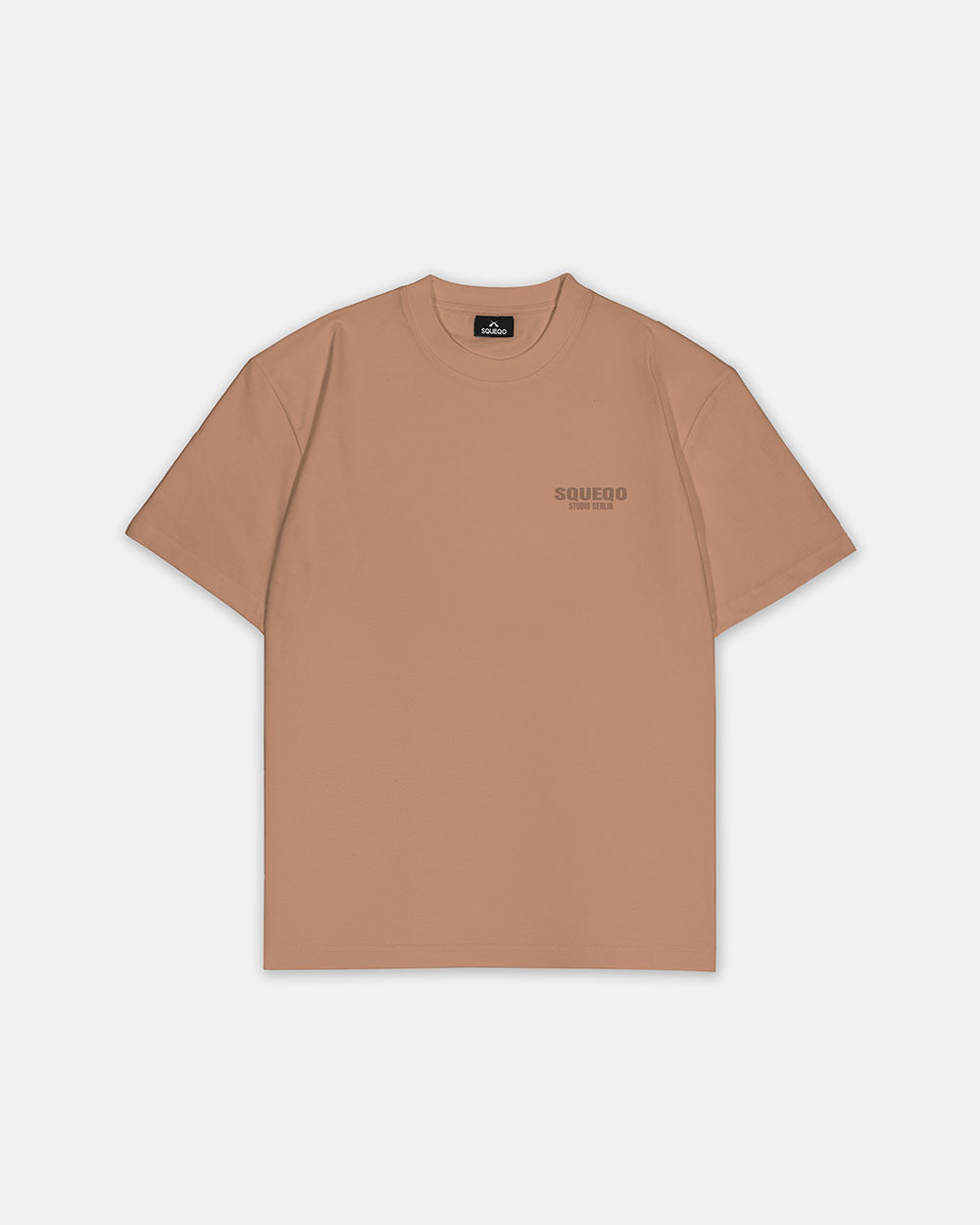 Nude-farbenes T-Shirt mit monochromem Studio Berlin Print auf der Rückseite.