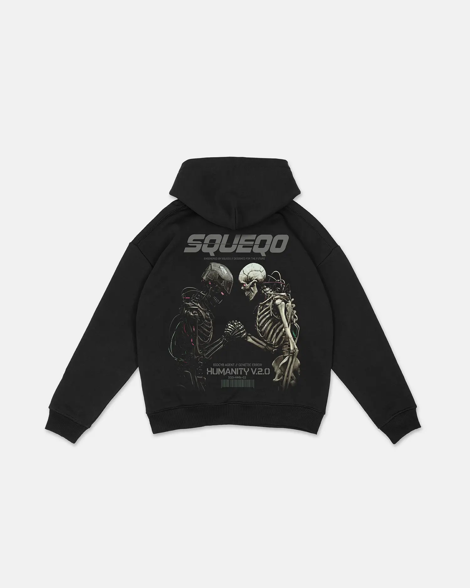 Das Design // High-Definition Art Print Auf dem tiefschwarzen Stoff kommt der Humanity V.2.0 Backprint maximal zur Geltung. Die Skelette sind im feinen Halbton-Raster gedruckt, mit lebendigen Farbdetails, während die Typografie in kühlem Industrial-Grey steht. Ein technischer Kontrast, der Blicke zieht.